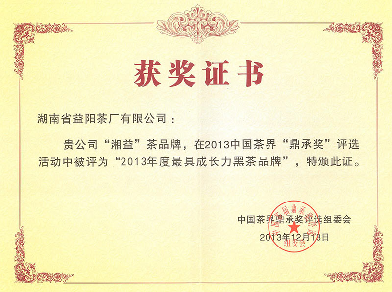中國(guó)最具成長(zhǎng)力黑茶品牌(鼎承獎(jiǎng))