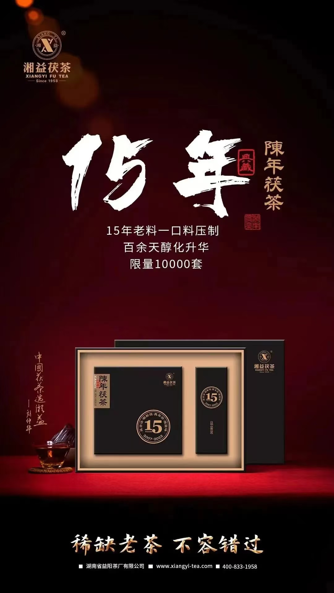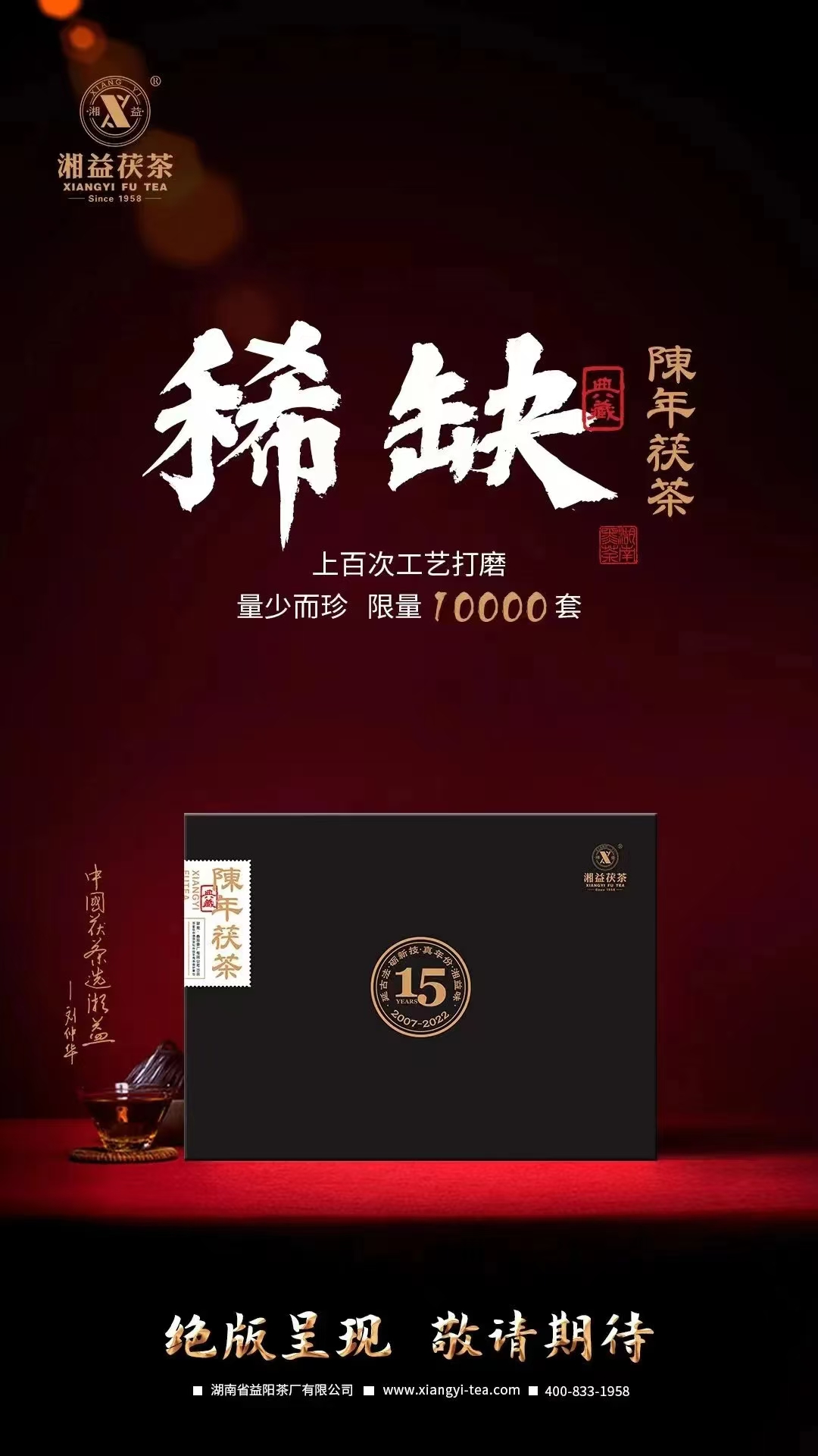 因其原料的稀缺,加之采用一口料制作,?陳年茯茶?限量發(fā)售10000套。每套均有獨立編號和典藏證書,并有劉杏益大師的親筆簽名。當下品飲,即可享受15年時光釀就的陳醇好味;投資收藏,保值升值空間十分巨大,未來可期。