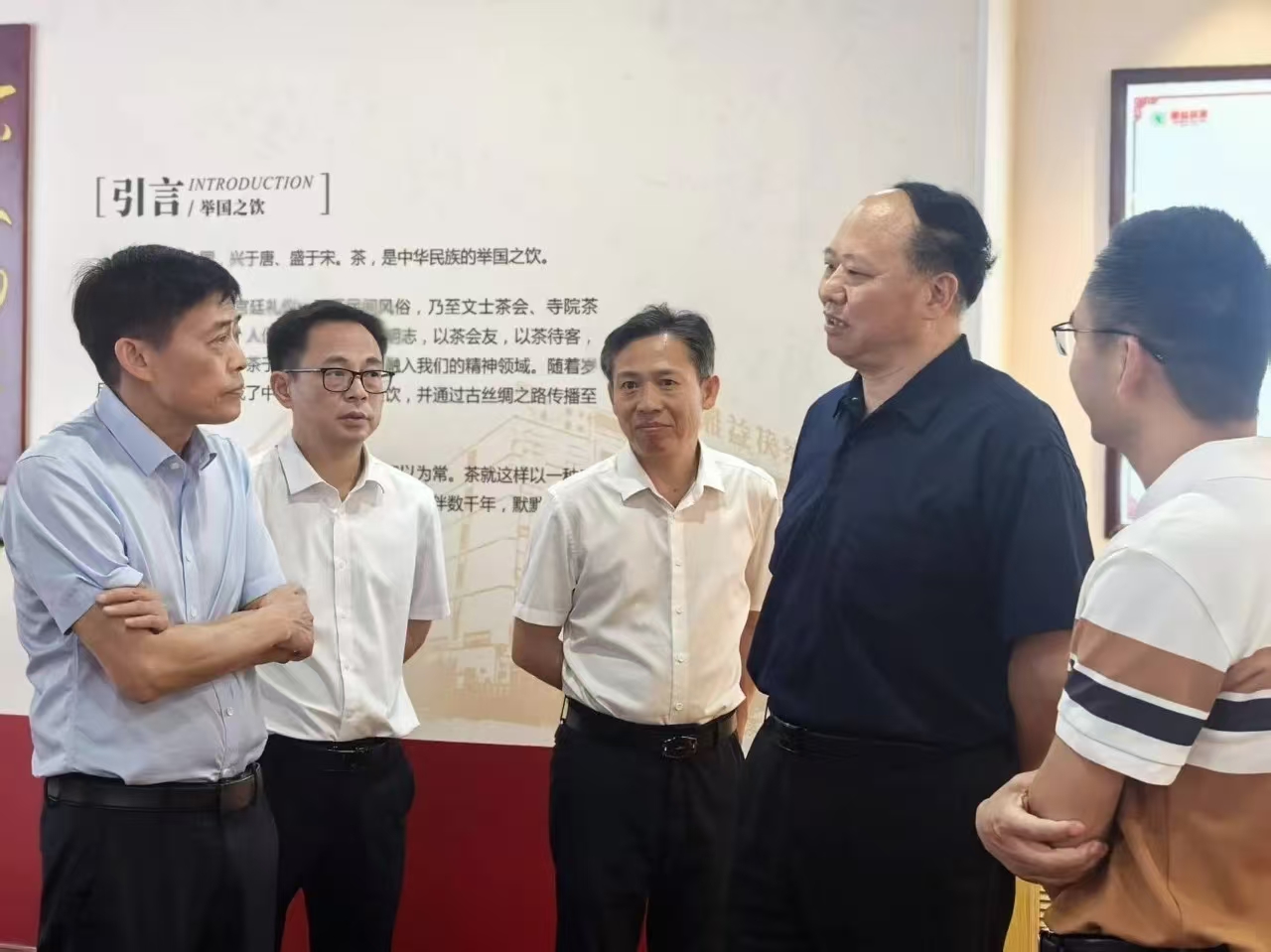 在董事長彭雄根、總經(jīng)理余智勇、國家級非遺傳承人劉杏益及副總經(jīng)理姚永軍的陪同下,調(diào)研組深入茯磚茶生產(chǎn)車間,觀摩了原料篩選、壓制、發(fā)花等核心工藝環(huán)節(jié)。文富恒主任委員在被譽(yù)為“茯茶靈魂”的“金花酵庫”,詳細(xì)詢問了冠突散囊菌群的培育技術(shù)與品質(zhì)控制標(biāo)準(zhǔn),對益陽茶廠在堅(jiān)持傳統(tǒng)工藝基礎(chǔ)上推進(jìn)標(biāo)準(zhǔn)化、規(guī)?;a(chǎn)的實(shí)踐給予高度評價(jià)。隨后,調(diào)研組一行走進(jìn)湘益茶博館,通過歷史文獻(xiàn)、制茶器具及茯茶實(shí)物,系統(tǒng)了解茯磚茶發(fā)展脈絡(luò)和公司的發(fā)展歷程。