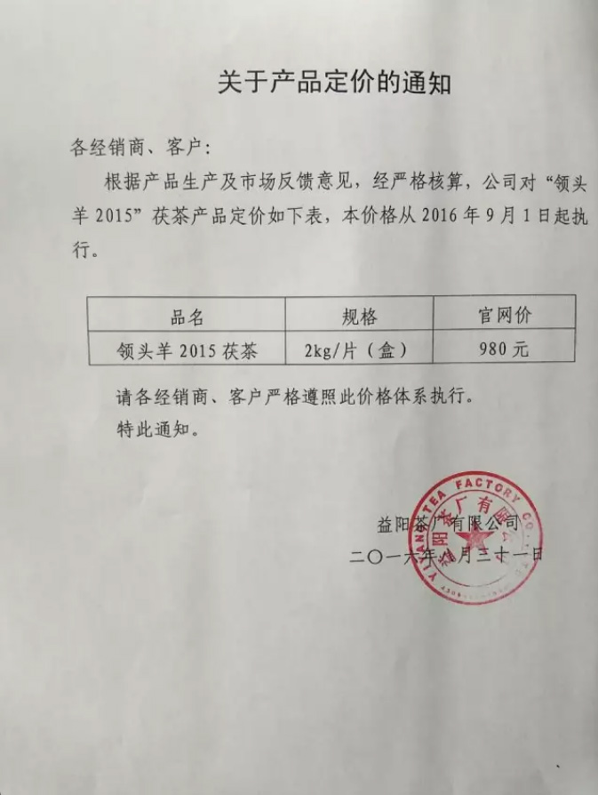 根據(jù)產(chǎn)品生產(chǎn)及市場(chǎng)反饋意見,經(jīng)嚴(yán)格核算,公司對(duì)“領(lǐng)頭羊2015”茯茶產(chǎn)品定價(jià)如下表,本價(jià)格從2016年9月1日起執(zhí)行。